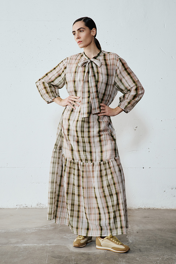 Check voile dress with mandarin collar