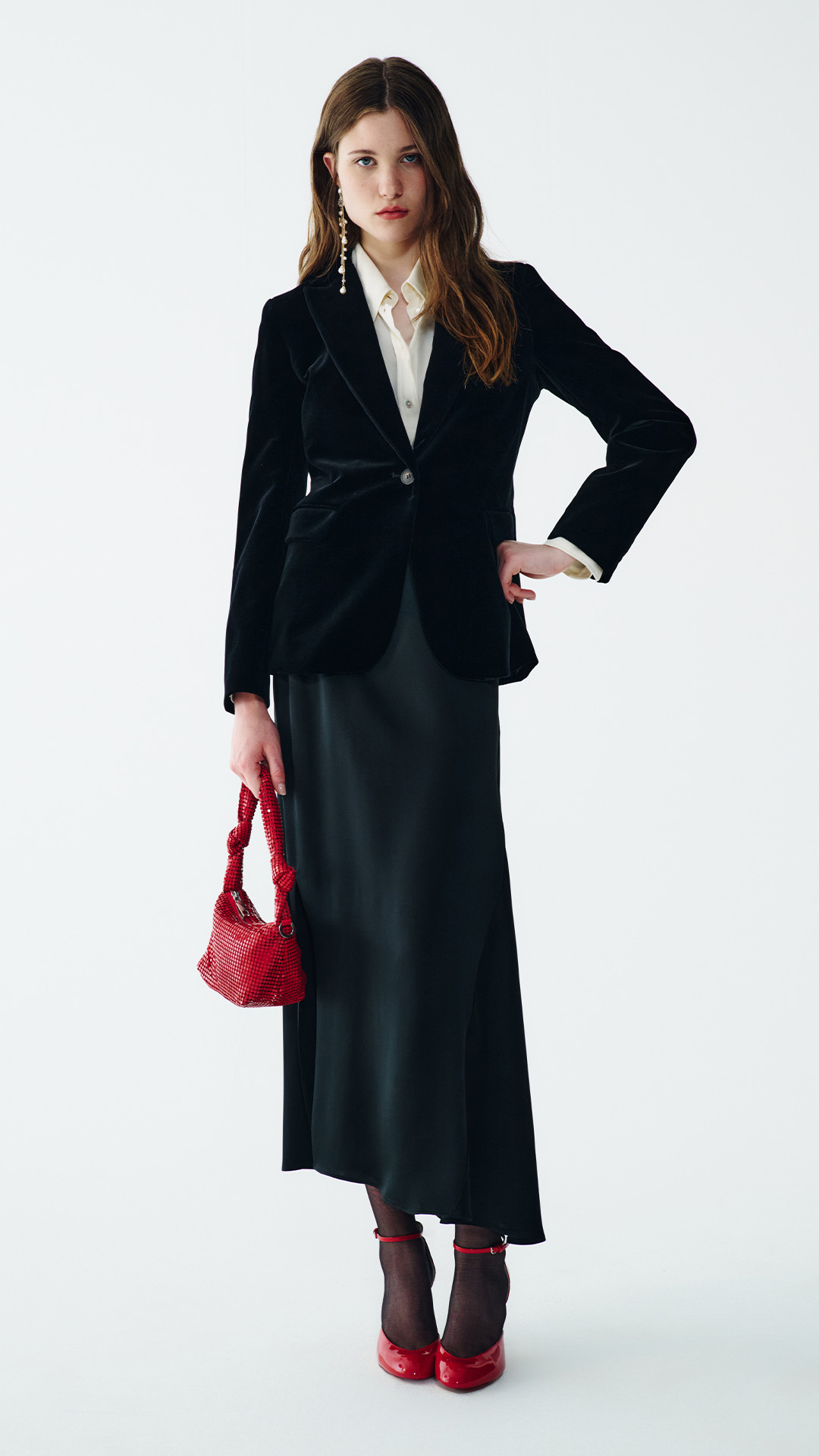 From an elegant jumpsuit to a floral embroidered minidress, every look shines with sparkly earrings and bold patent leather heels. Ready to steal the spotlight?