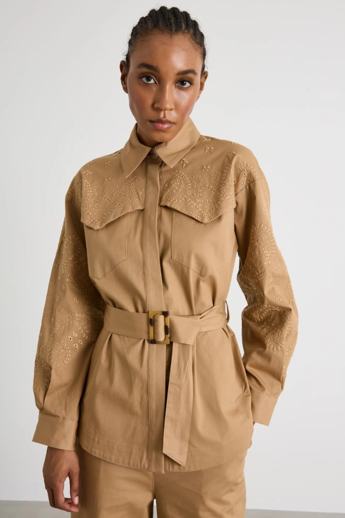 Straight-fit jacket in embroidered cotton gabardine, featuring a shirt collar, long sleeves, chest patch pockets with flaps and side welt pockets. Finished with a rounded back hem. Fastening with concealed buttons and a belt.