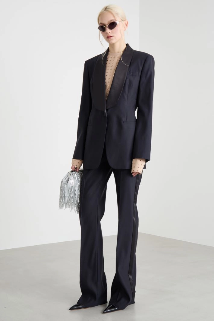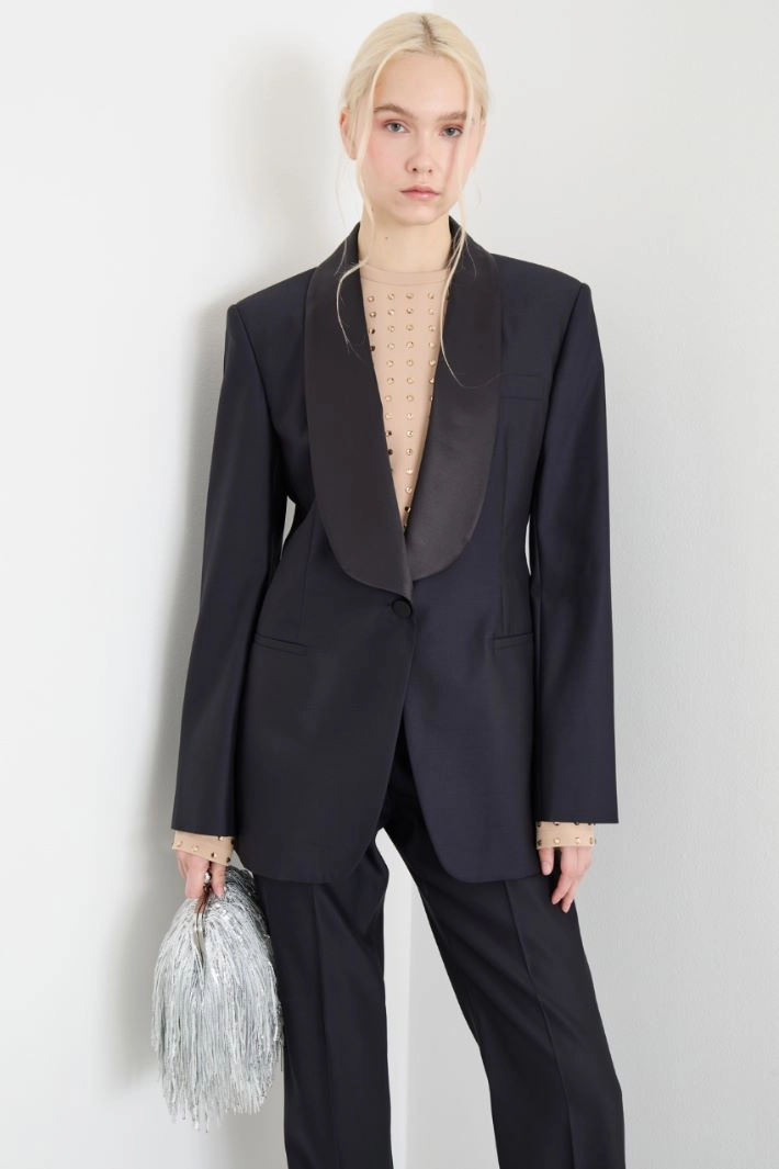 Fitted blazer in matte-finish wool and silk satin, with a lustrous satin shawl lapel, a breast pocket and side welt pockets. Long sleeves with covered buttons and pleated detailing on the back. Semi-lined. Single-button fastening.