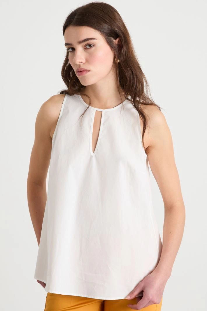A-line top in cotton poplin, with a round neckline and cut-out detail on the front. Features a keyhole detail on the back, complete with a self-tie fastening.