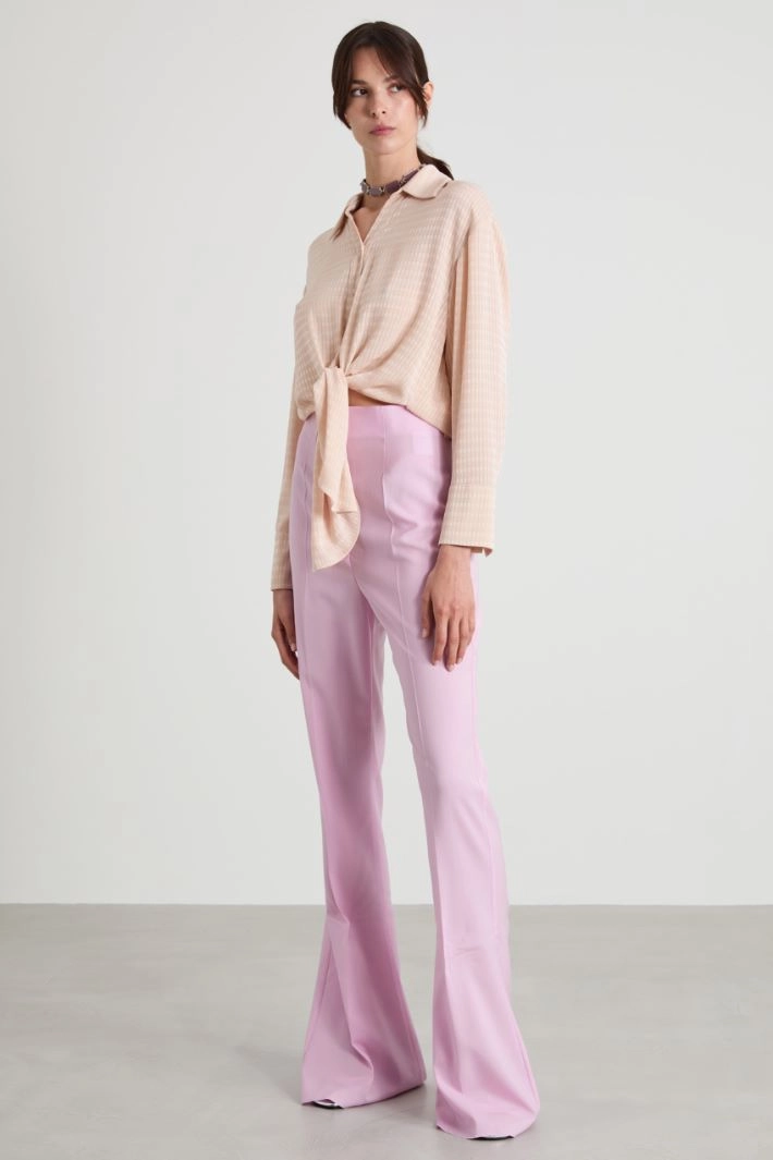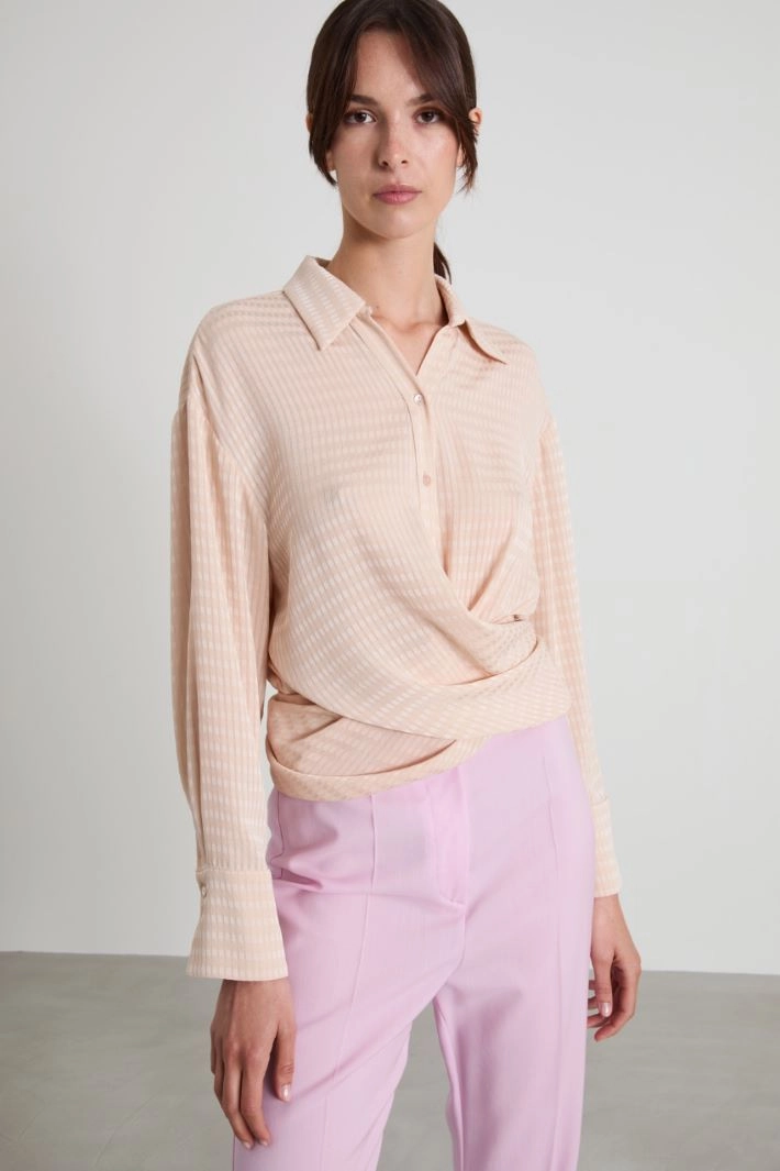 Straight-cut shirt in flowing fabric with shiny and opaque geometric pattern, classic collar, long sleeves with high cuff and button. Asymmetrical hem straight on the back and rounded long on the front to tie or cross with the removable matching laces. Fastening with buttons.