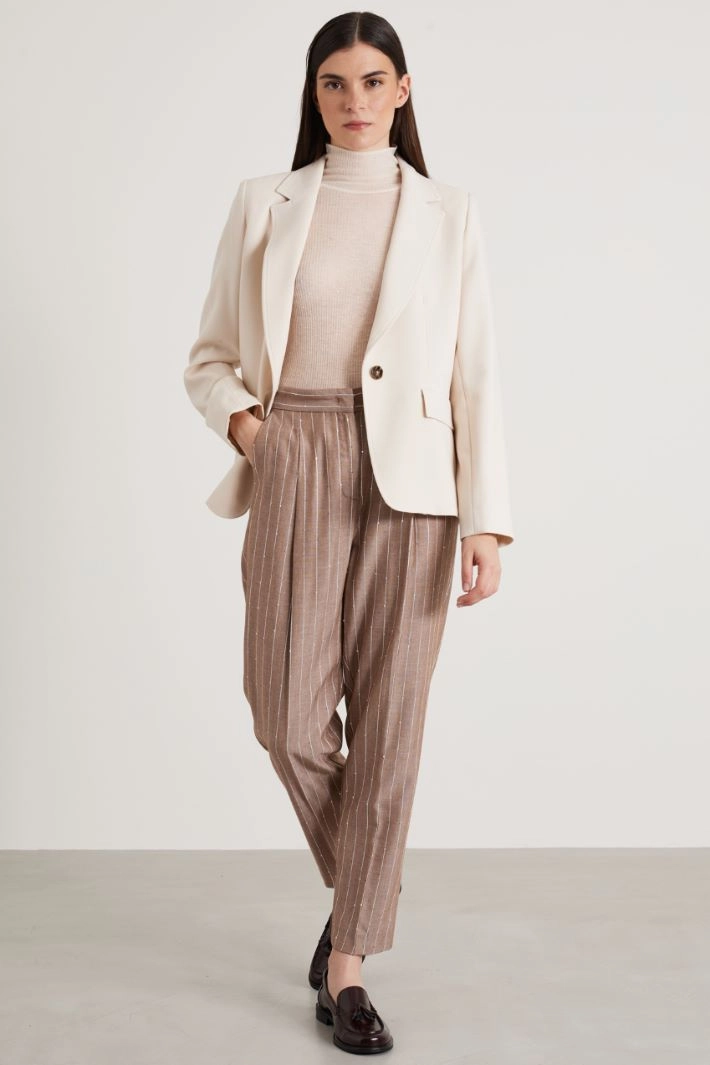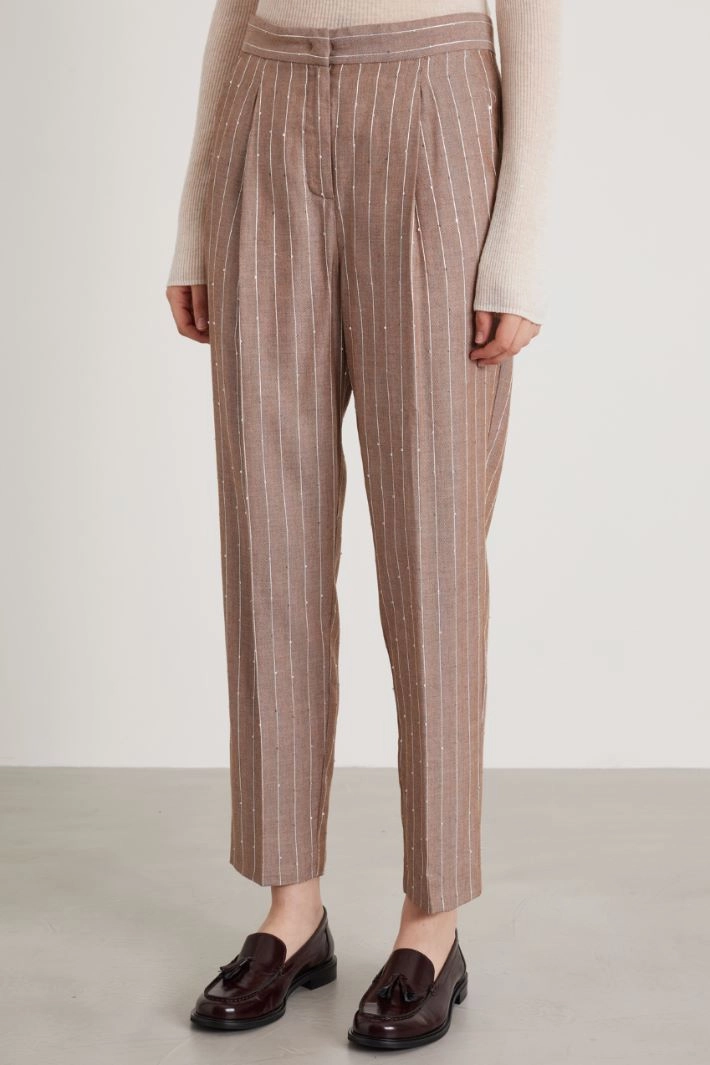 Cigarette trousers in viscose-blend herringbone fabric with a pinstripe design and micro sequins, with French pockets on the front, welt pockets on the back, darts and pressed crease along the length. Hidden fastening with zip, button and hook.