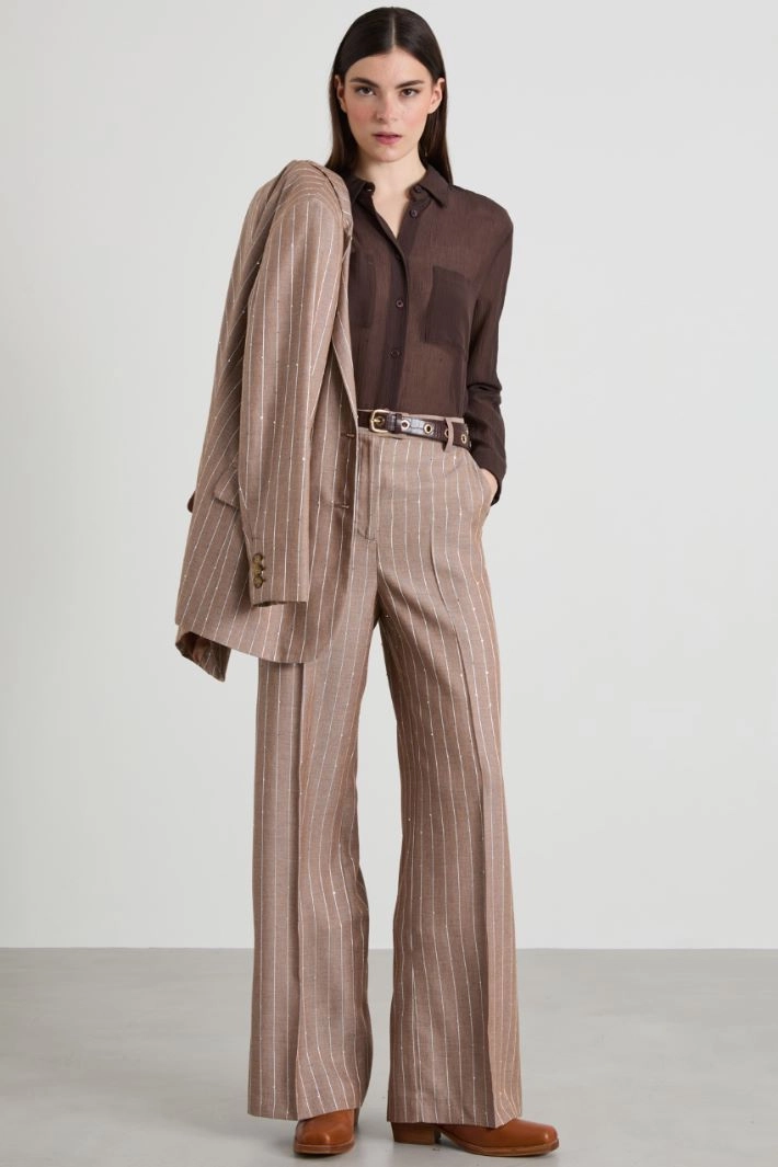 Straight-cut trousers in viscose-blend herringbone fabric with a pinstripe design and micro sequins, with belt loops at the waist, French pockets at the front, welt pockets at the back and pressed crease along the length. Hidden fastening with zip, button and hook