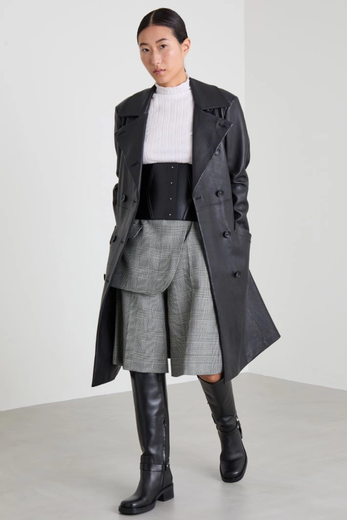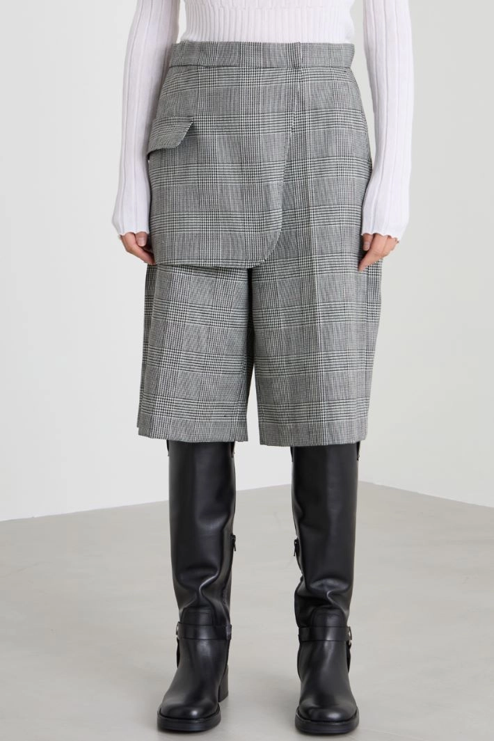 Straight-fit Bermuda shorts in yarn-dyed pure wool batavia, with removable asymmetrical flap, side French pockets and hidden fastening with zip, button and hooks.