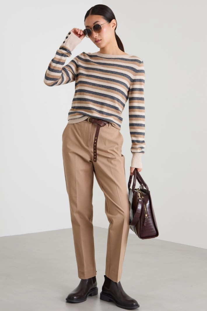 Cigarette trousers in stretch cotton and viscose twill, with belt loops at the waist, side French pockets and welt pockets on the back, crease pressed lengthwise and hidden fastening with zip, button and hook.