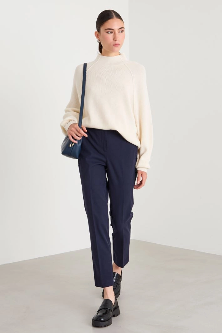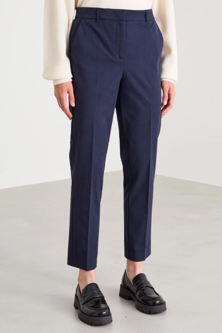 Cigarette trousers in stretch cotton and viscose twill, with belt loops at the waist, side French pockets and welt pockets on the back, crease pressed lengthwise and hidden fastening with zip, button and hook.
