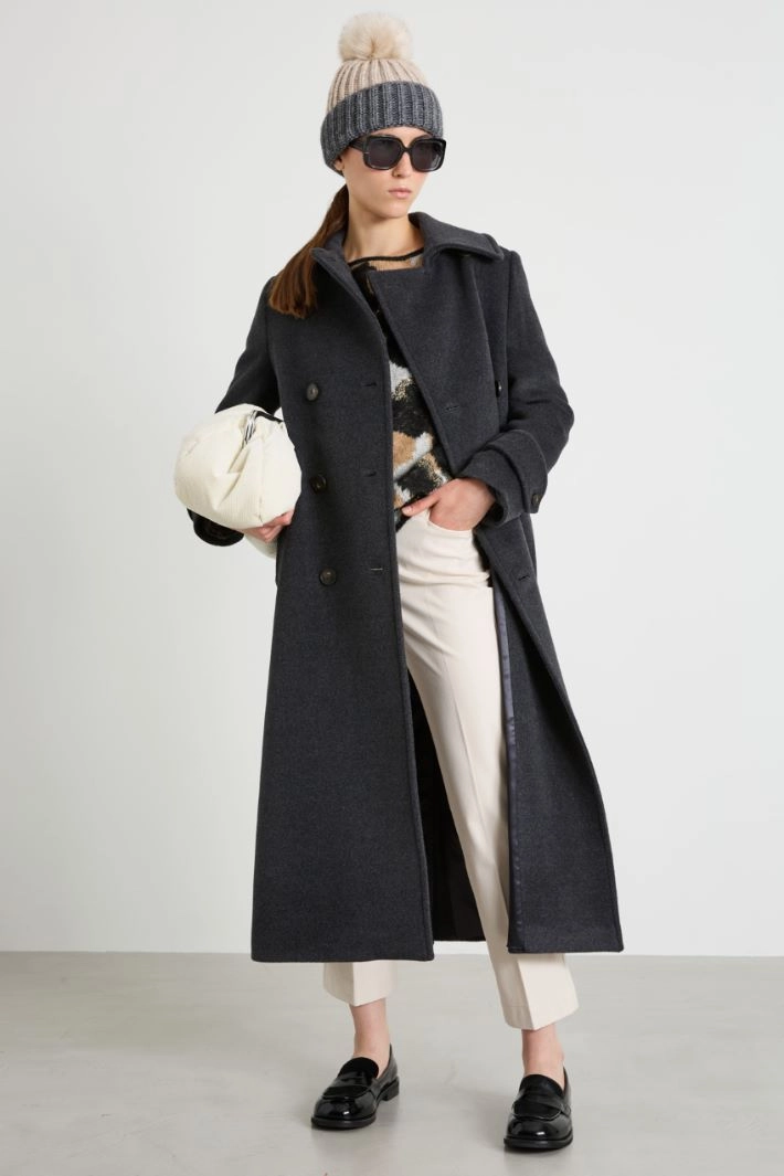 Flare trousers in stretch cotton and viscose twill, with belt loops at the waist, side pockets and welt pockets on the back, pressed crease. Fastening with hidden zip and button