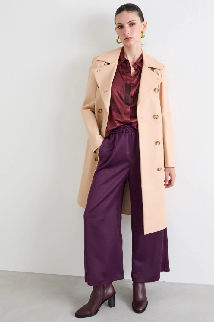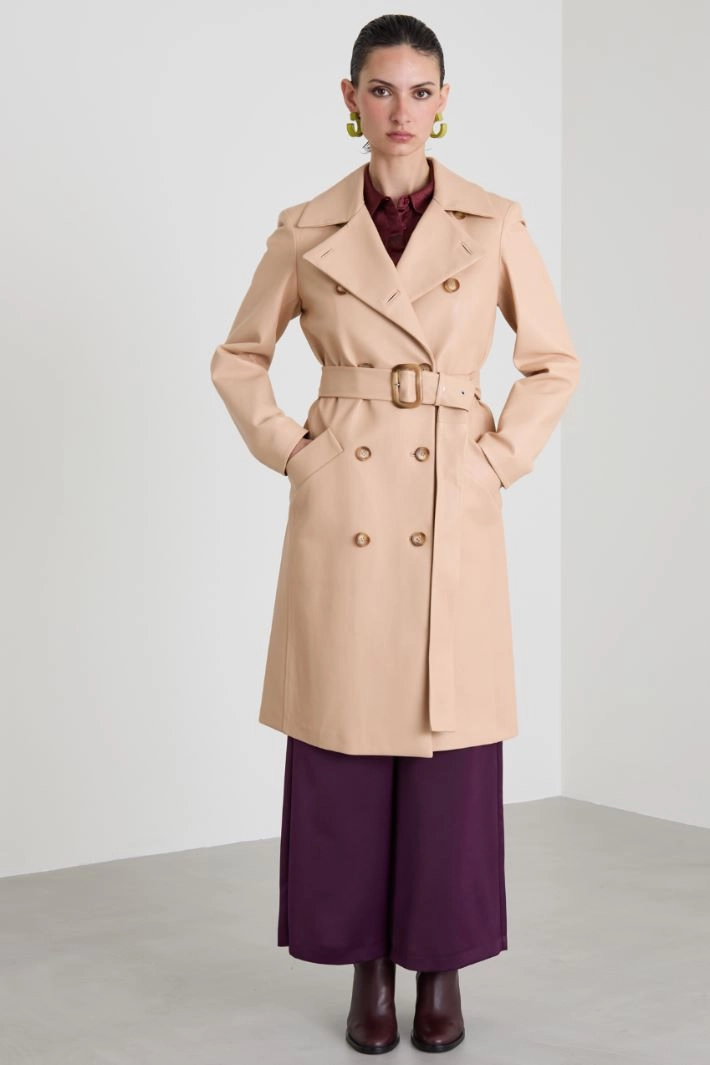 Straight-fit trench coat in genuine nappa leather, with lapel collar, long sleeves and side welt pockets. Central slit on the back and double-breasted fastening with buttons. Matching belt. Lined.
