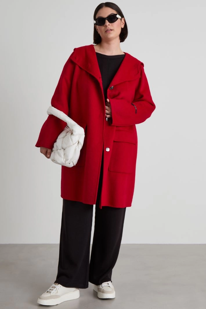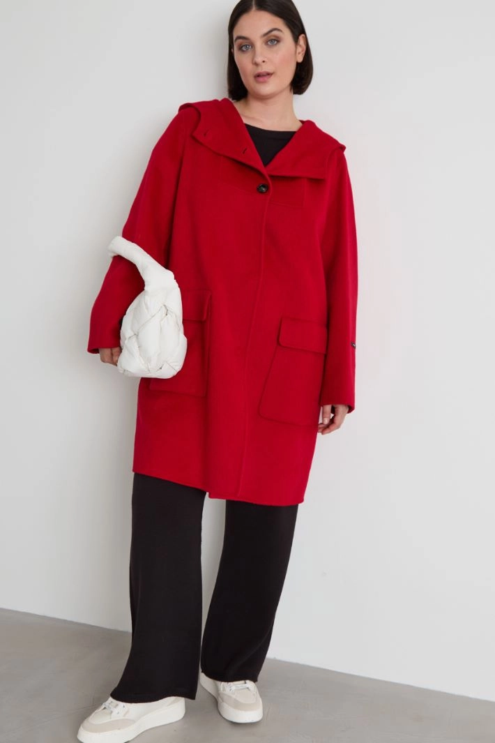 Straight-fit coat in double wool blend, with hood, long sleeves, side patch pockets with flap and single-breasted fastening with buttons. Unlined.