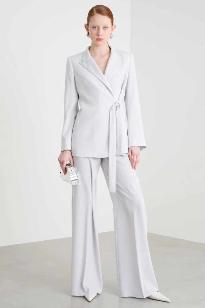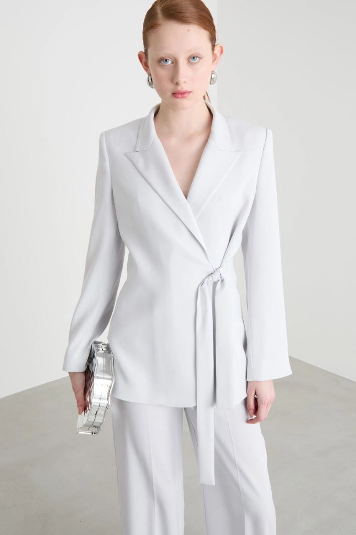 Fitted jacket crafted in cady crepe. This lined piece features satin-trimmed peak lapels and long sleeves with single-button cuffs. Fastening with a self-tie ribbon at the side.