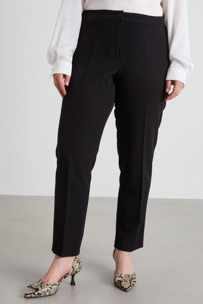 Cigarette trousers in fluid stretch fabric, with elastic waistband insert on the back and crease ironed lengthwise. Zip and button fastening.