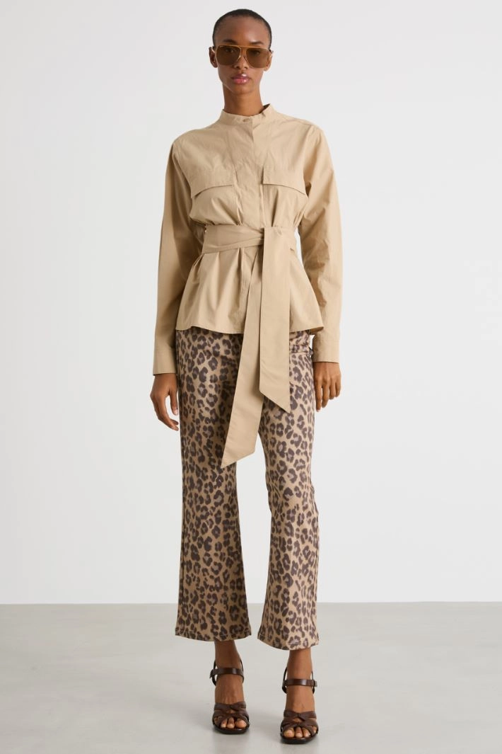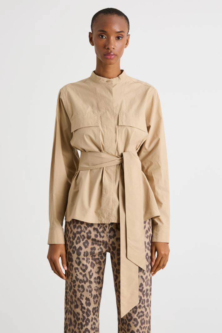 Straight-fit jacket in pure cotton poplin, with a mandarin collar, long sleeves with buttoned cuffs, flapped patch pockets on the chest and an elasticated insert on the back. Fastening with concealed buttons and a belt.