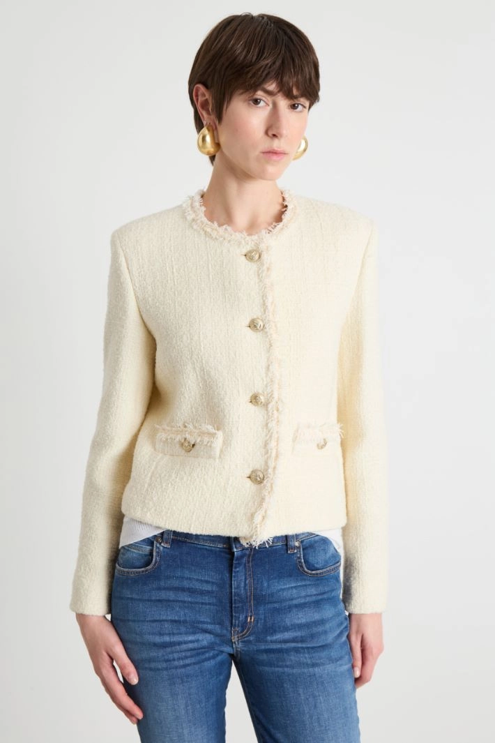 Straight-fit cropped jacket in a subtly textured wool blend, featuring a round neckline, long sleeves, and welt pockets with buttoned flaps. Trimmed with fringed passementerie. Button fastening.