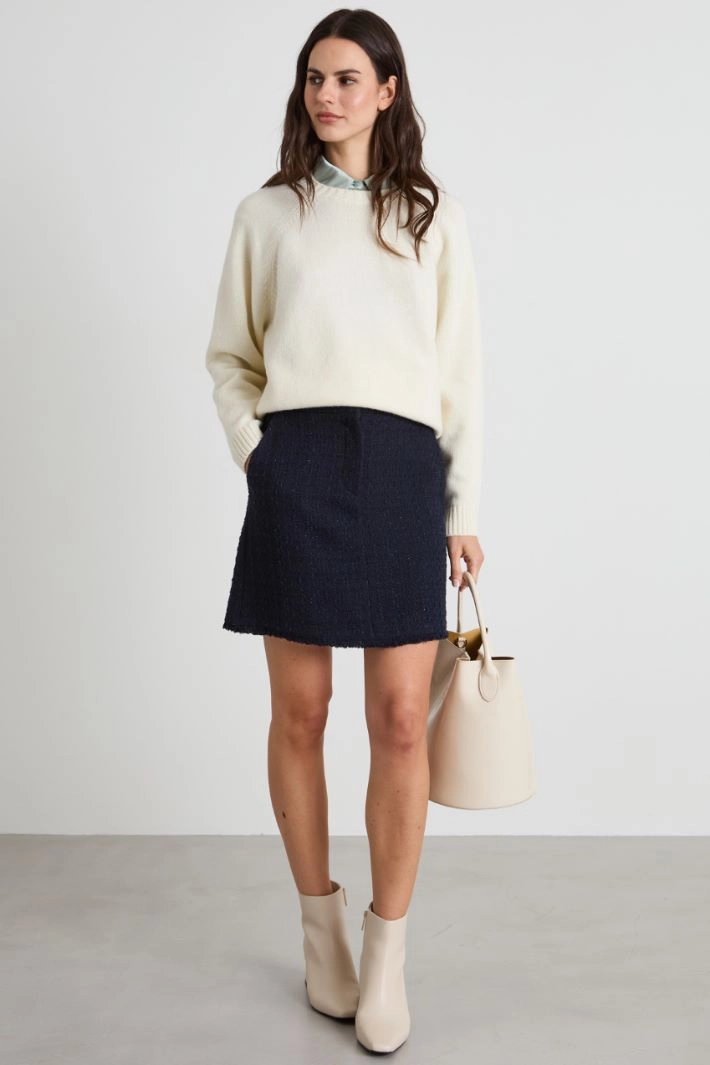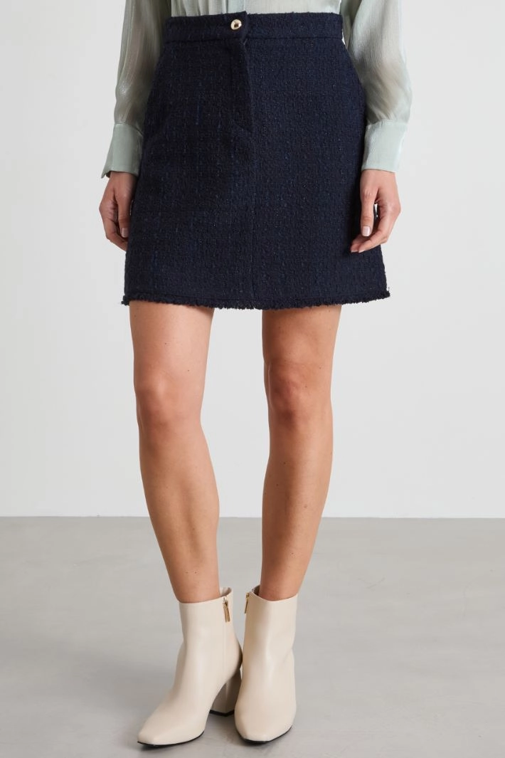 Straight-cut skirt in lamé cotton blend basketweave with French pockets and zip and button fastening.