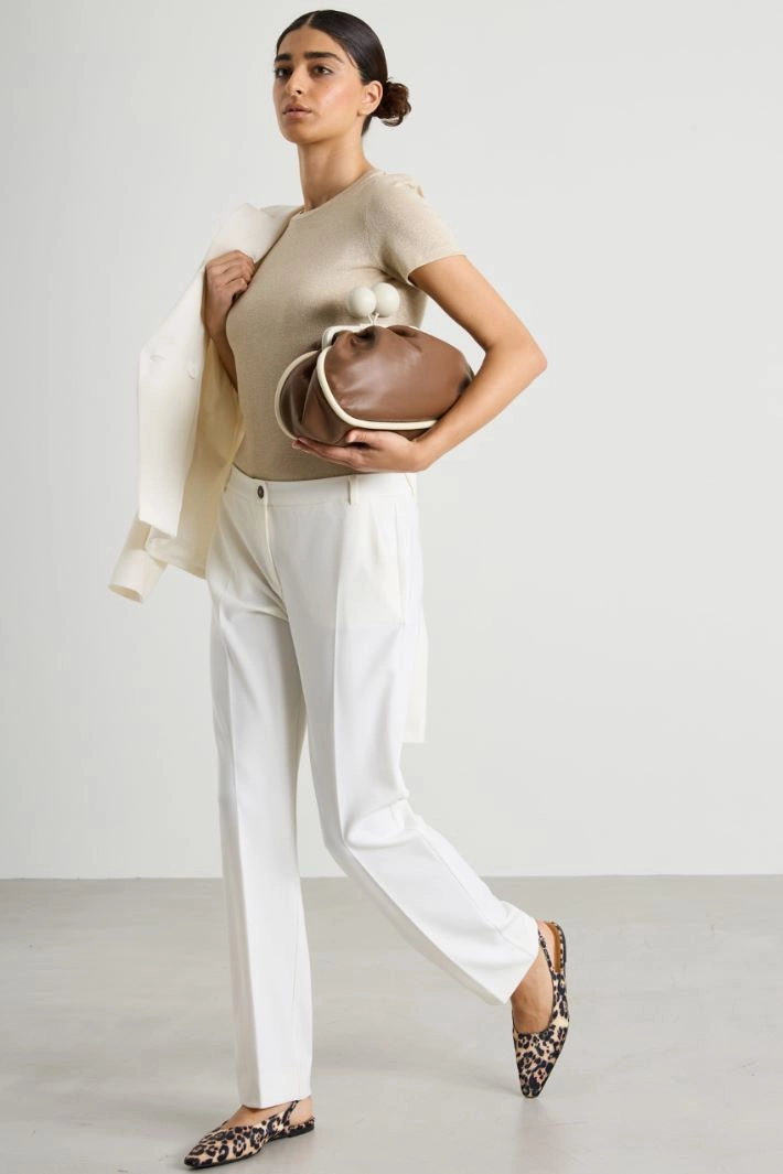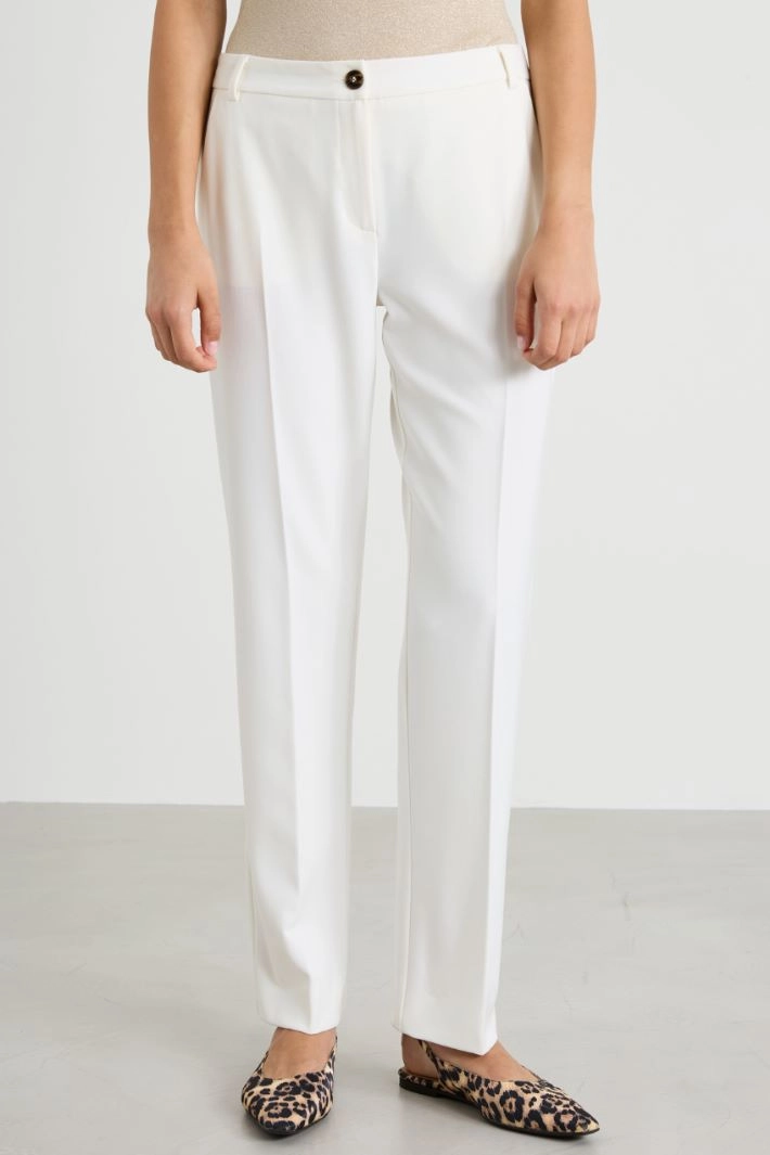 Straight-cut trousers in stretch twill fabric, with belt loops, French pockets and pressed crease lengthwise. Zip and button fastening.