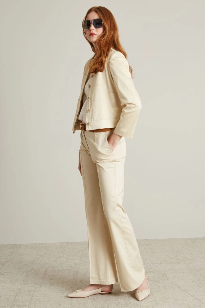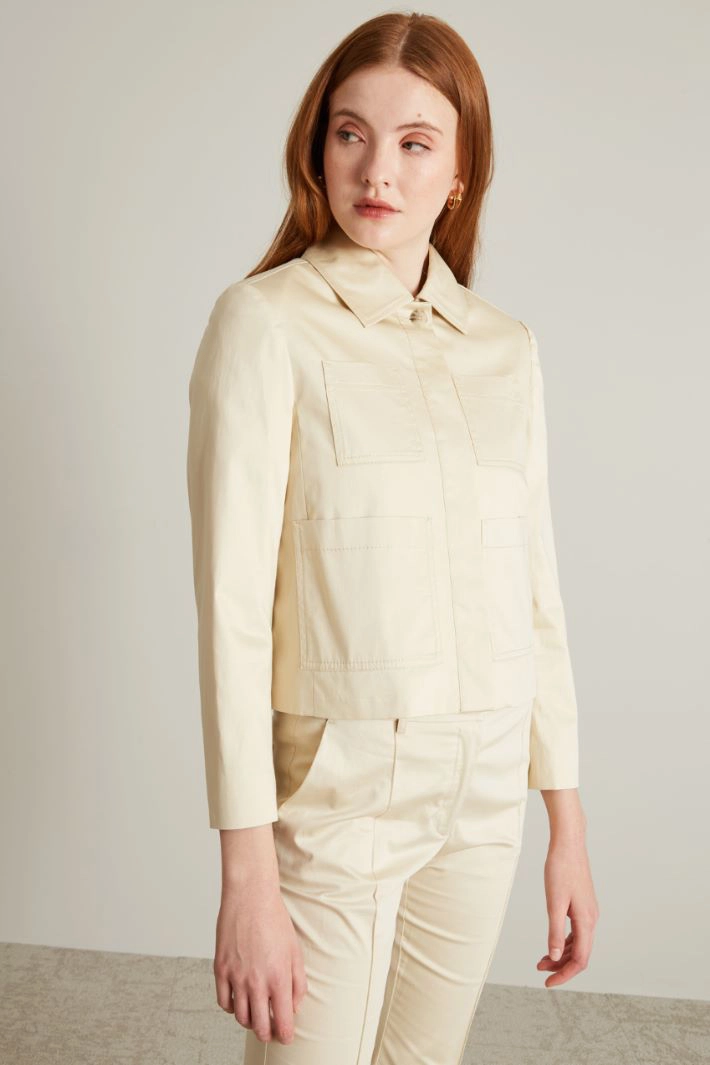Boxy jacket in all-over printed stretch cotton satin, with shirt collar, long sleeves, side patch pockets and hidden button fastening.