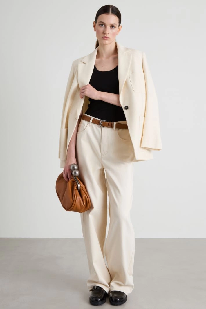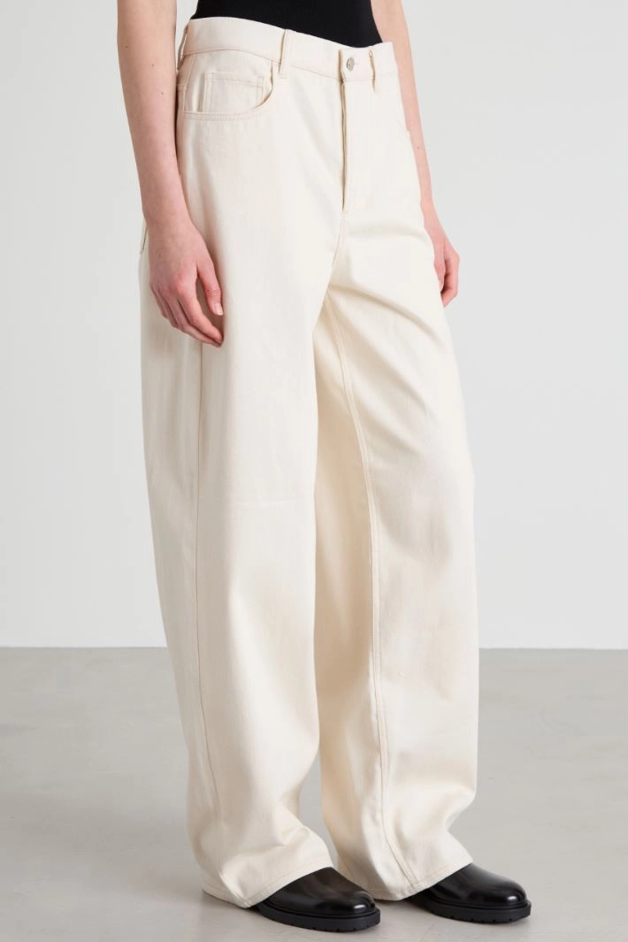 Loose-fit trousers in cotton drill, with belt loops at the waist, patch pockets on the back and fastening with a hidden zip and button.