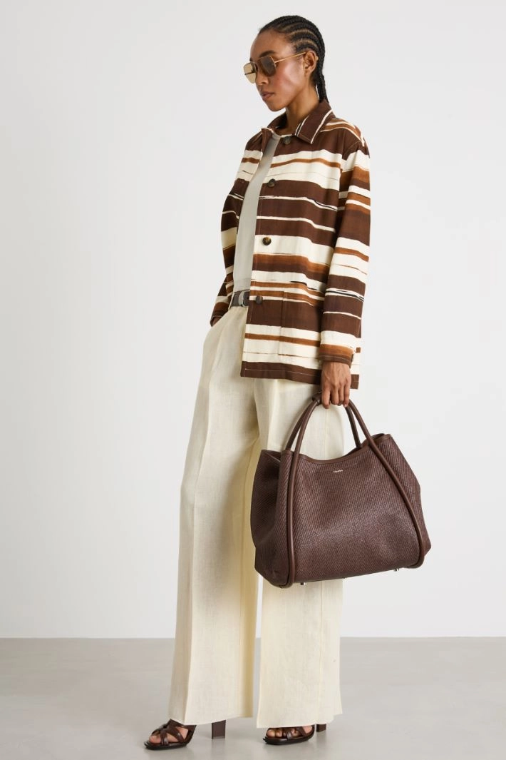 Straight-cut shirt jacket crafted in printed cotton-linen drill. This piece features a point collar, long sleeves, patch pockets on the front and rounded side vents. Button fastening.
