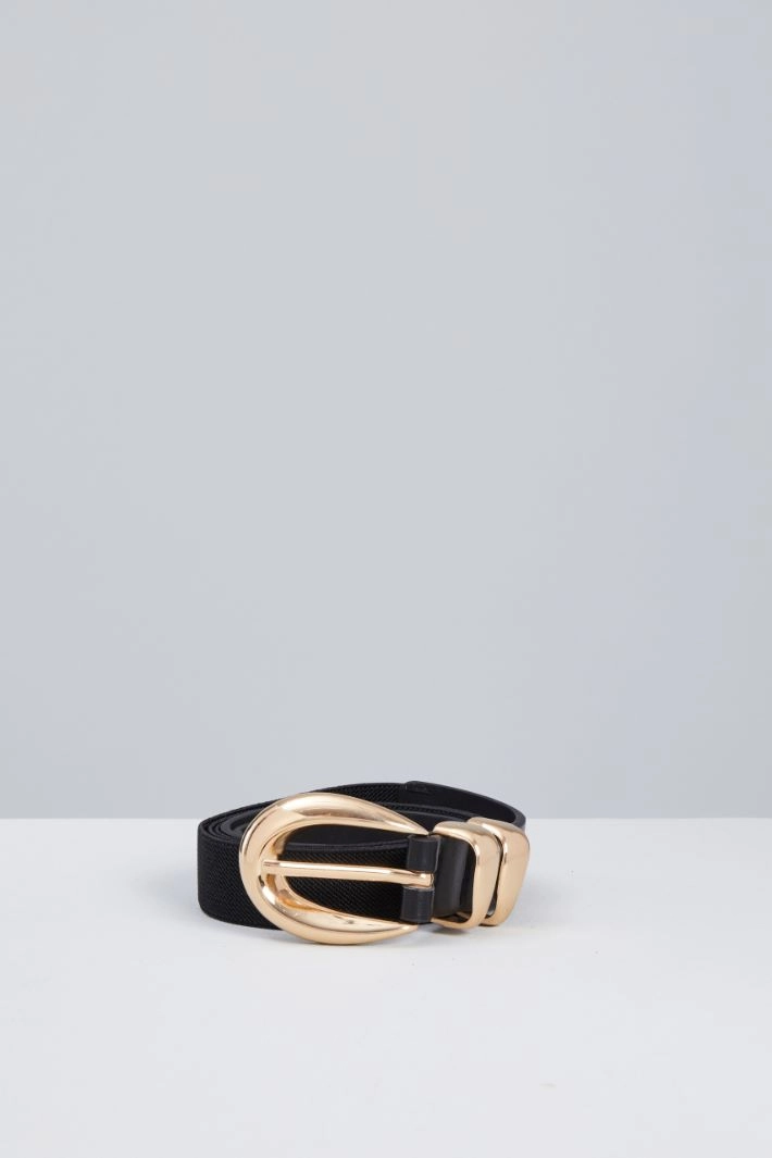 Belt in elastic fabric, with faux leather inserts, oval buckle and double metal loop.
