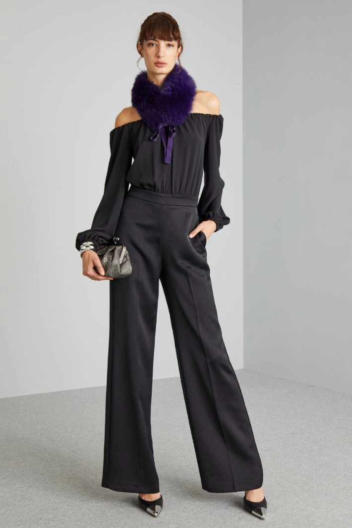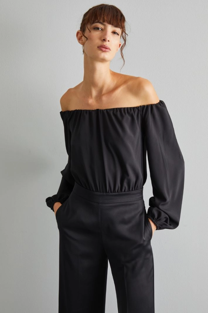 Long two-material jumpsuit. Crepe de chine bodice with off-the-shoulder neckline finished with an elastic insert and long balloon sleeves. Palazzo trousers in shiny envers satin, with inset side pockets and pressed creases. Fastening with an invisible zip on the back.