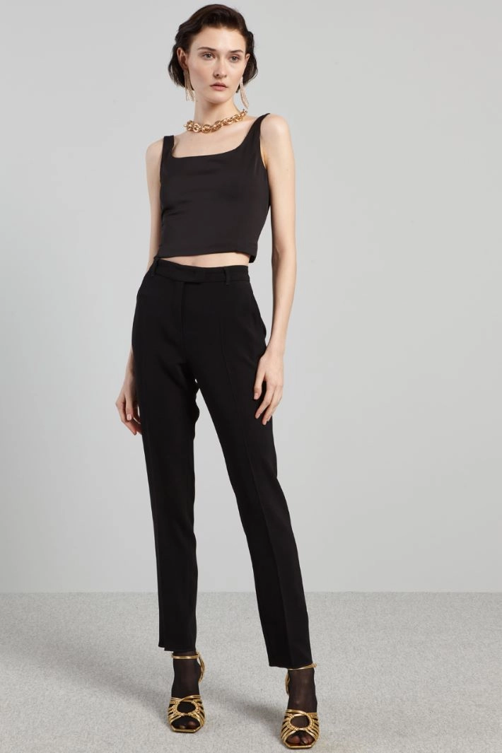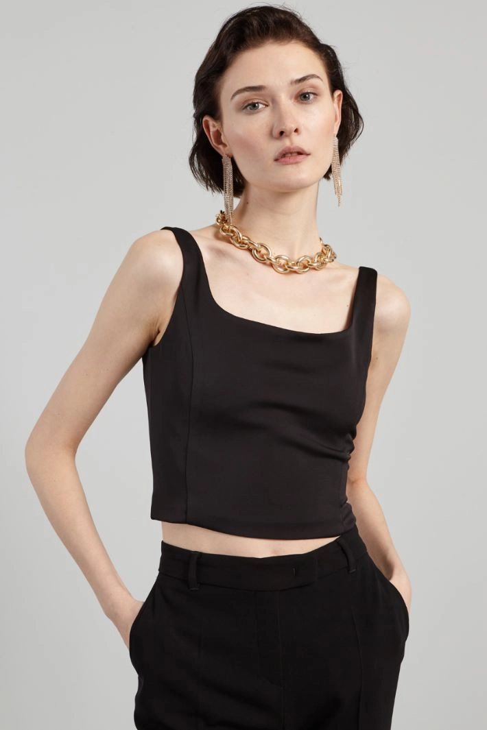 Slim-fit sleeveless crop satin top with wide square neckline and thick straps. Invisible zip fastening on the back. Lined.